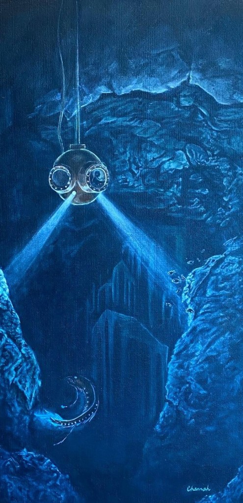 Take Us Deeper, Acrylic, 12×24 In 1931, researchers William Beebe and Otis Barton set a record depth for ocean exploration in the bathysphere, a submersible that was lowered 1,426 feet into the ocean. On the ship above them, a trio of women–Gloria Hollister, Else Bostelmann, and Jocelyn Crane–communicated with the diver, drew the animals described, and attempted to identify them. While they didn’t find any strange or sinister structures (that they spoke of, at least), the monster fish in my painting is based off one of Bostelmann’s illustrations.